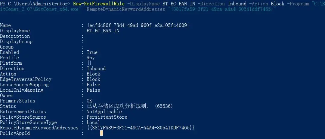 New-NetFirewallRule -DisplayName “BT_BC_BAN_IN” -Direction Inbound -Action Block -Program "C:\BitComet_2.07\BitComet_x64.exe" -RemoteDynamicKeywordAddresses "{3817fa89-3f21-49ca-a4a4-80541ddf7465}"