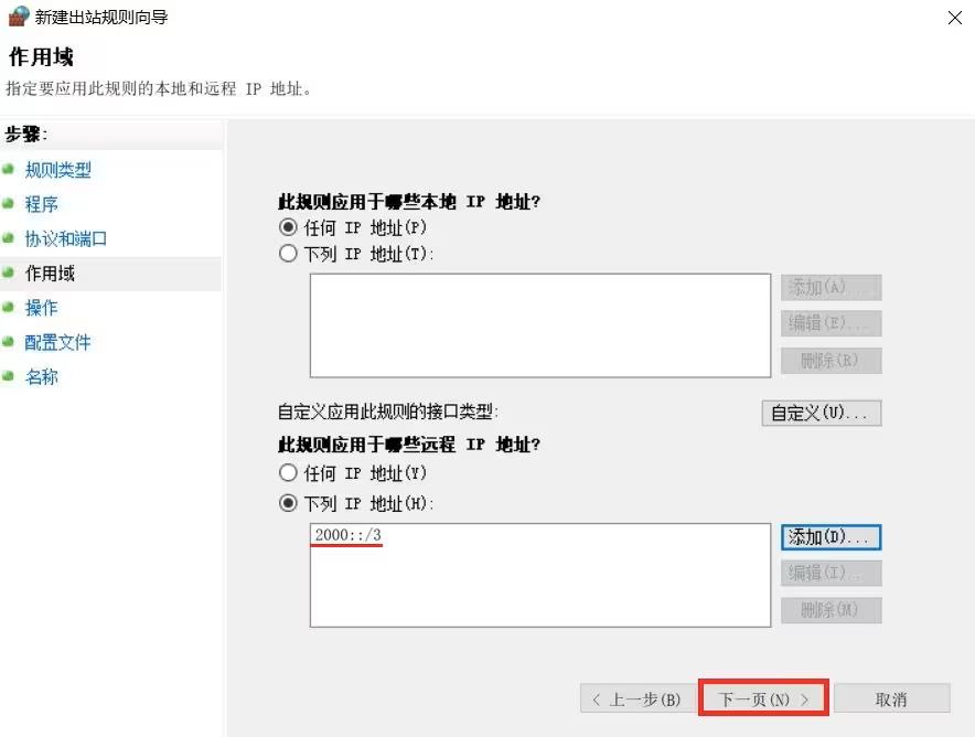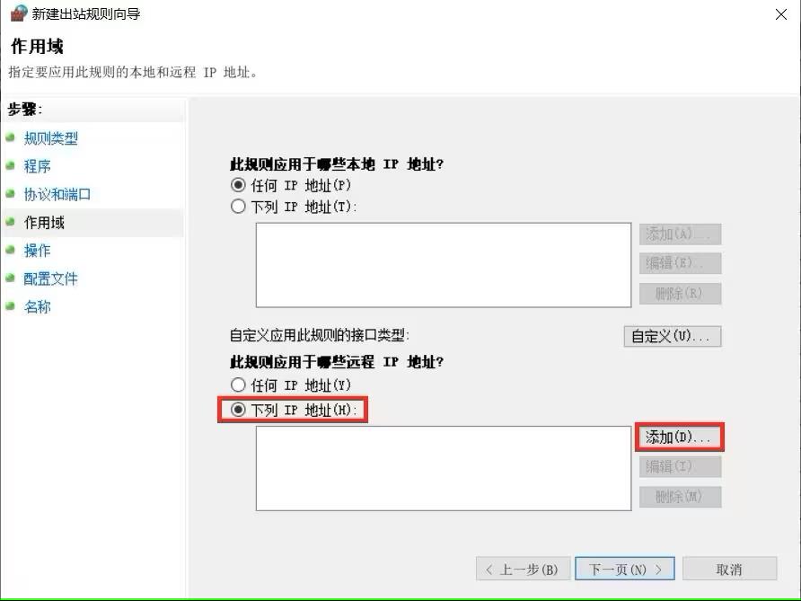 作用域 在远程IP中选择下列IP地址 并点击添加