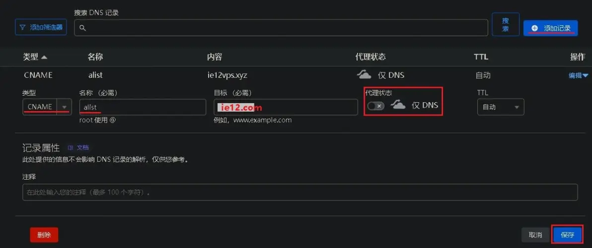 代理状态关闭即仅DNS 》 目标直接填写主域名即可 》 保存