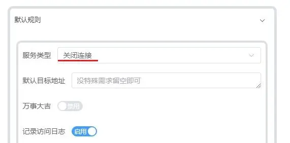 在默认规则中将服务类型设置为 关闭连接即可 默认目标地址不用填写