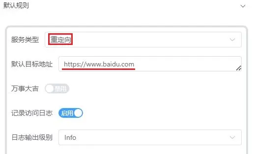滚动页面 》 点开默认规则 》 修改服务类型为 重定向 》