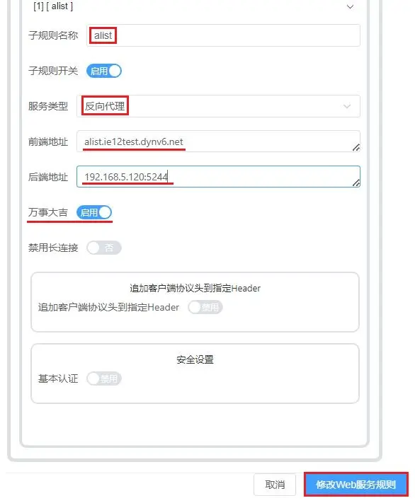 (只填域名即可不用加HTTP或者端口号) - 后端地址 则是在内网访问服务时所使用的IP和端口 这里使用