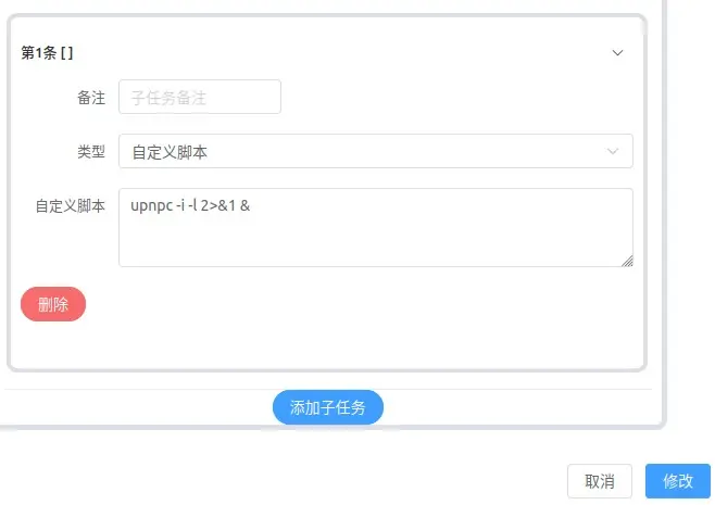 upnpc -i -e "rule name" -a @ ${port} 穿透通道监听端口 穿透类型 2>&1 &