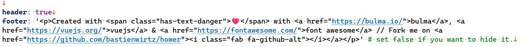 footer: '<p>使用 <span class="has-text-danger">❤️</span> 与 <a href="https://bulma.io/">bulma</a>, <a href="https://vuejs.org/">vuejs</a> 及 <a href="https://fontawesome.com/">font awesome</a> 创建 // 在 <a href="https://github.com/bastienwirtz/homer"><i class="fab fa-github-alt"></i></a> 上 Fork 我</p>' # 设为 false 可隐藏