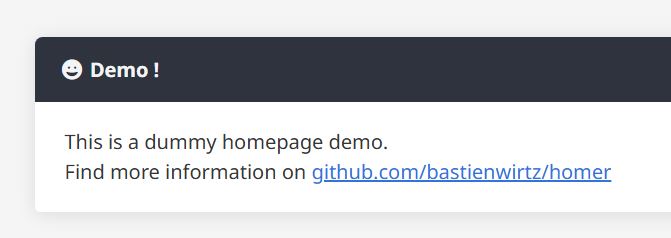 content: "这是一个示例主页演示。<br />更多信息请访问 <a href='https://github.com/bastienwirtz/homer'>github.com/bastienwirtz/homer</a>"