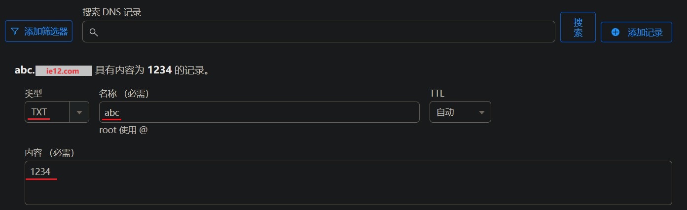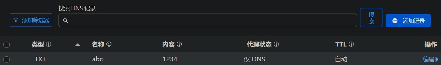 先创建一个TXT记录 获取更新令牌 区域ID和DNS记录ID