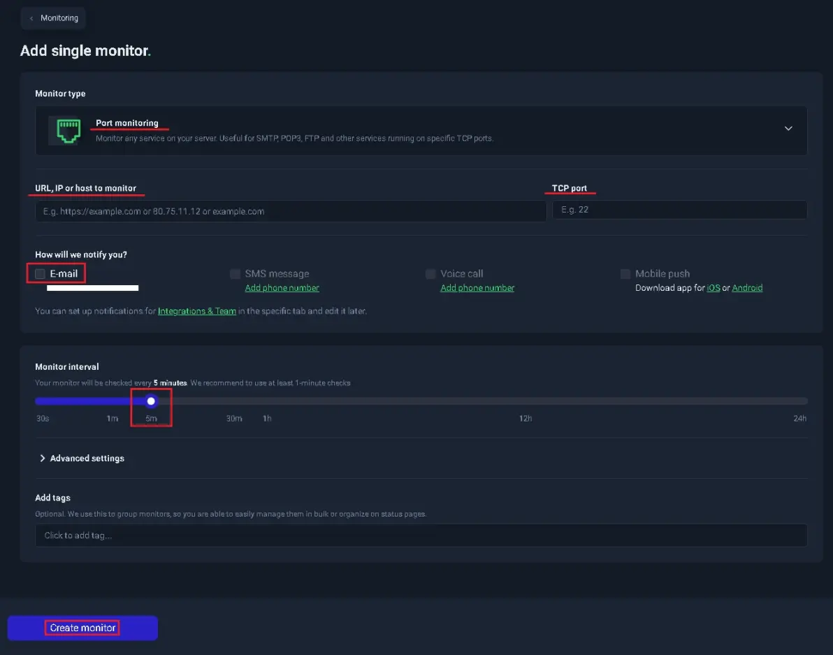 选择监控类型 填写IP和端口 建议取消勾选下面的邮件提醒