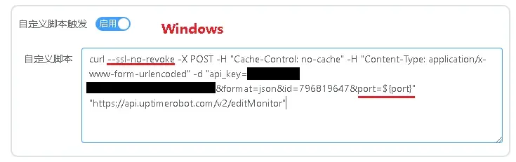 curl --ssl-no-revoke -X POST -H "Cache-Control: no-cache" -H "Content-Type: application/x-www-form-urlencoded" -d "api_key=你的APIKey&format=json&id=监视器ID&port=新端口号" "https://api.uptimerobot.com/v2/editMonitor"