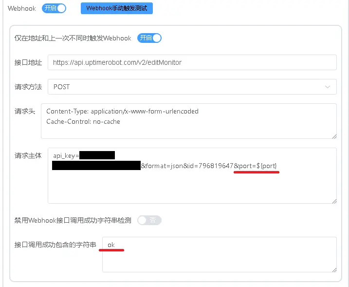 同时将 禁用Webhook接口调用成功字符串检测 改为 否